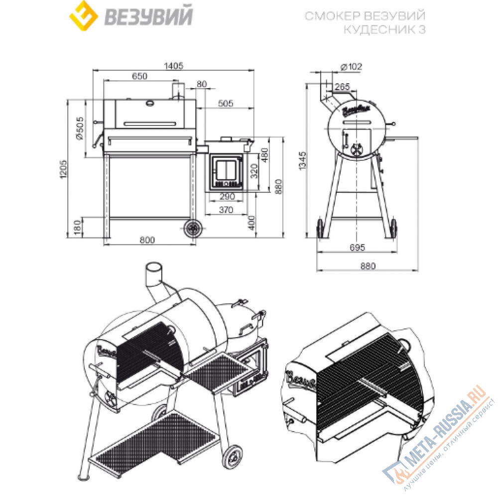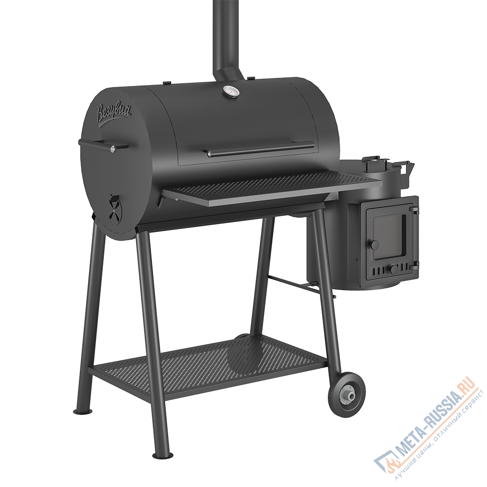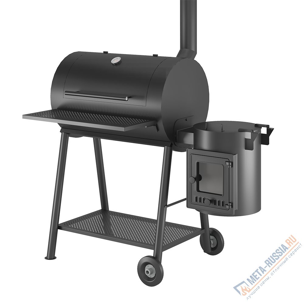 Для удобного использования на передней поверхности смокера сделана съёмная стальная полка для размещения продуктов и посуды. Смокер установлен на подставке с надёжными стальными ножками. В нижней части подставки сделана полка, на которой удобно хранить дрова и инструменты для работы со смокером. Две ножки смокера оснащены колёсами для удобства перемещения изделия по зоне барбекю. Для перекатывания смокера используется ручка на боковой стороне основного модуля смокера.