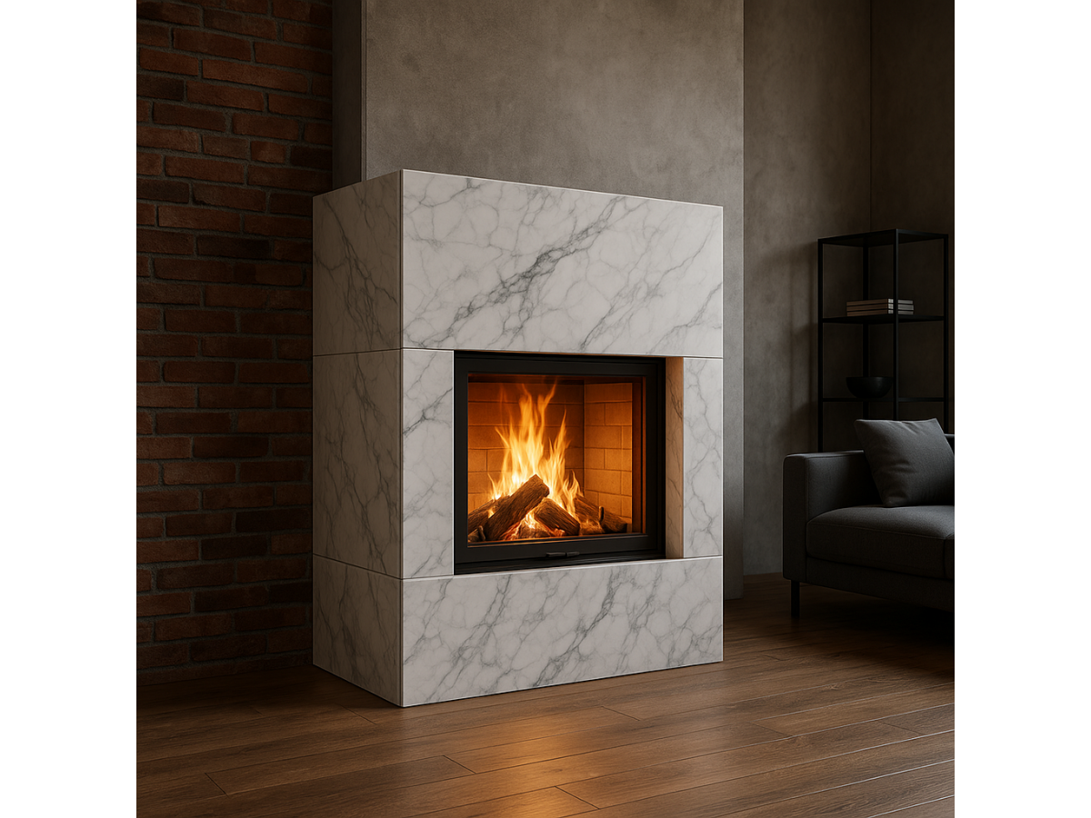 После установки топки наступает этап облицовки. Она не только придаёт камину завершённый вид, но и защищает стены от перегрева.
