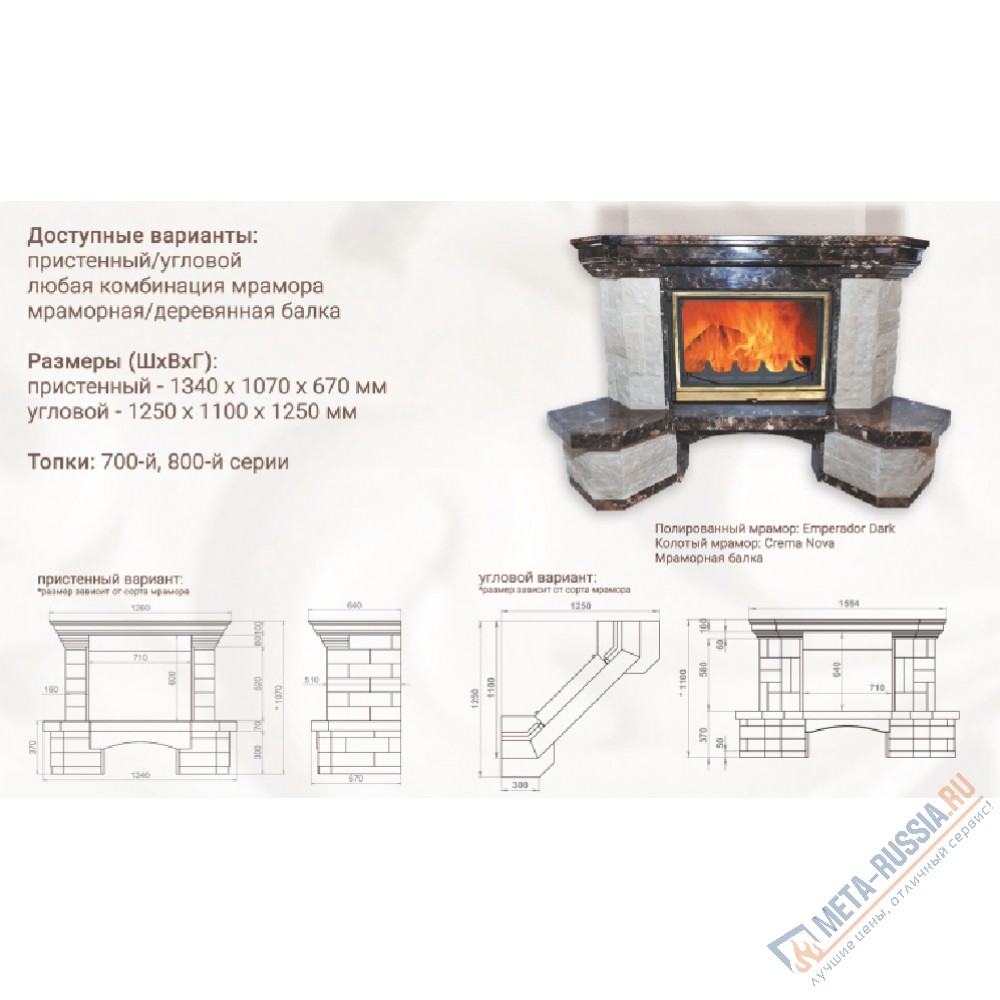 Цена зависит от сорта мрамора (цвета), размеры каминной топки и какое открывание двери топки боковое или вверх. Цены в карточке товара указаны на 700 и 800 серию под боковое открывание двери. Если у Вас уже каминная топка установлена и требуется каминная облицовка это уже будет индивидуальный проект и просчет стоимости делается отдельно.
