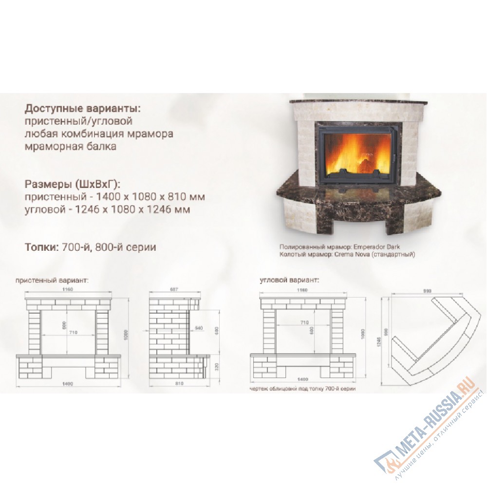 Цена зависит от сорта мрамора (цвета), размеры каминной топки и какое открывание двери топки боковое или вверх. Цены в карточке товара указаны на 700 и 800 серию под боковое открывание двери. Если у Вас уже каминная топка установлена и требуется каминная облицовка это уже будет индивидуальный проект и просчет стоимости делается отдельно.
