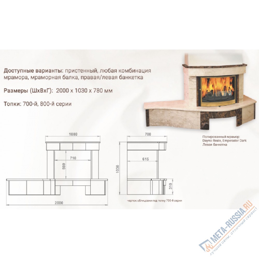 Цена зависит от сорта мрамора (цвета), размеры каминной топки и какое открывание двери топки боковое или вверх. Цены в карточке товара указаны на 700 и 800 серию под боковое открывание двери. Если у Вас уже каминная топка установлена и требуется каминная облицовка это уже будет индивидуальный проект и просчет стоимости делается отдельно.