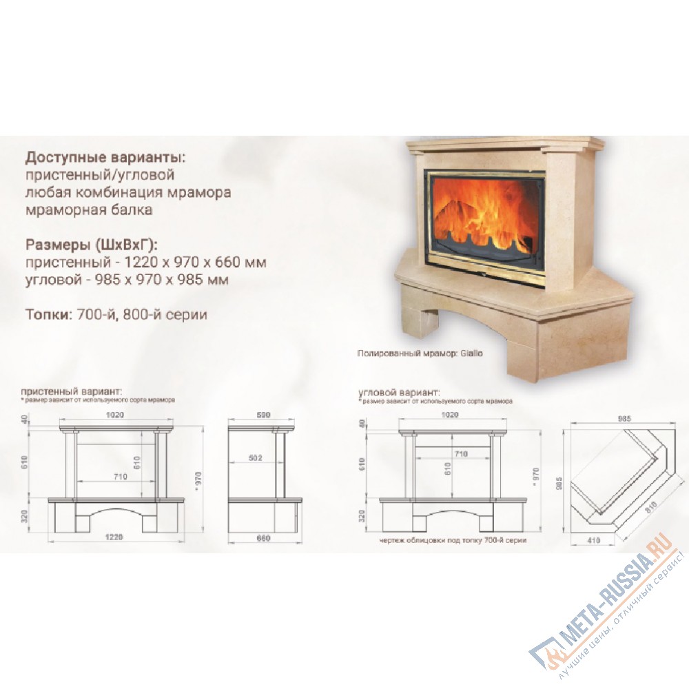 Цена зависит от сорта мрамора (цвета), размеры каминной топки и какое открывание двери топки боковое или вверх. Цены в карточке товара указаны на 700 и 800 серию под боковое открывание двери. Если у Вас уже каминная топка установлена и требуется каминная облицовка это уже будет индивидуальный проект и просчет стоимости делается отдельно.
