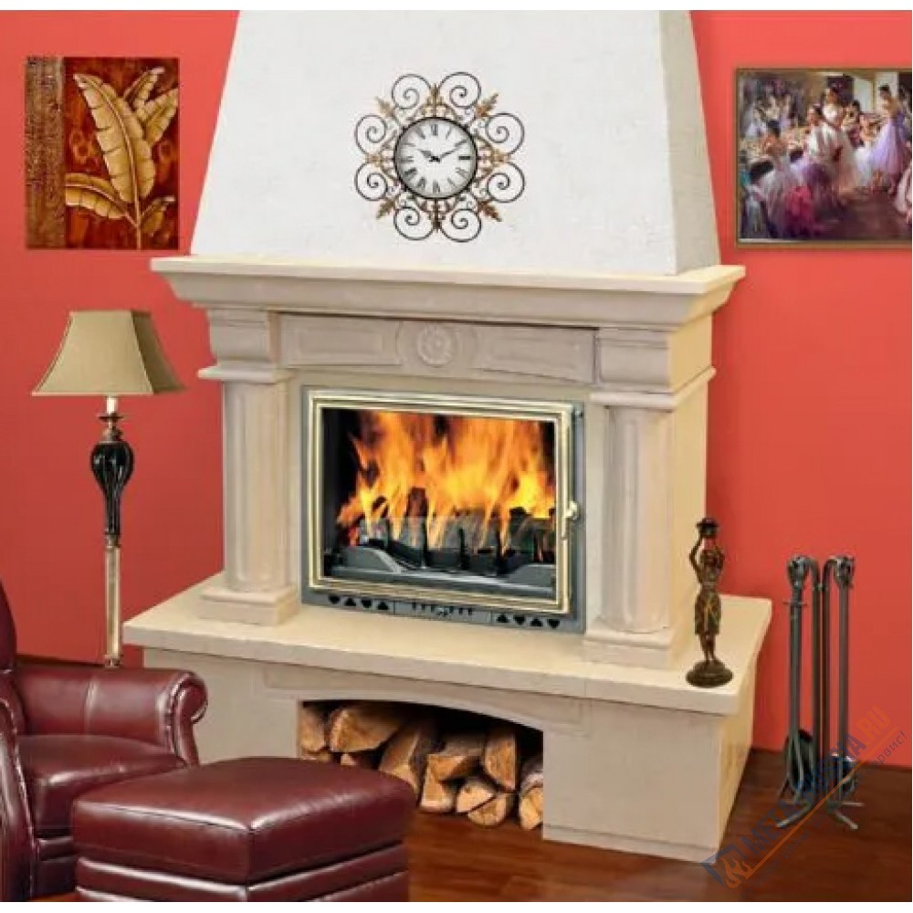 Данная облицовка изготовлена из натурального камня в стиле кантри. Она отлично сочетается с классическими топками 700 и 800 мм. Под заказ можно сделать индивидуальный проект под любую каминную топку. В нижней части облицовки находится ниша для хранения дров, а на верхней балке можно расположить разнообразные аксессуары для украшения интерьера.