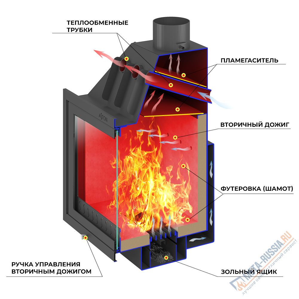 Пламя и дымовые газы, догорая, огибают пламегаситель в верхней части топочной камеры. В дымосборнике над конвекционными трубами расположен второй пламегаситель, который повторно меняет направление движения газов и таким образом способствует их полному догоранию в топке. За счёт совместной работы двух пламегасителей достигается максимальная тепловая эффективность каминной топки АСТОН 600, в том числе повышается теплоотдача печи путём усиления конвекции.