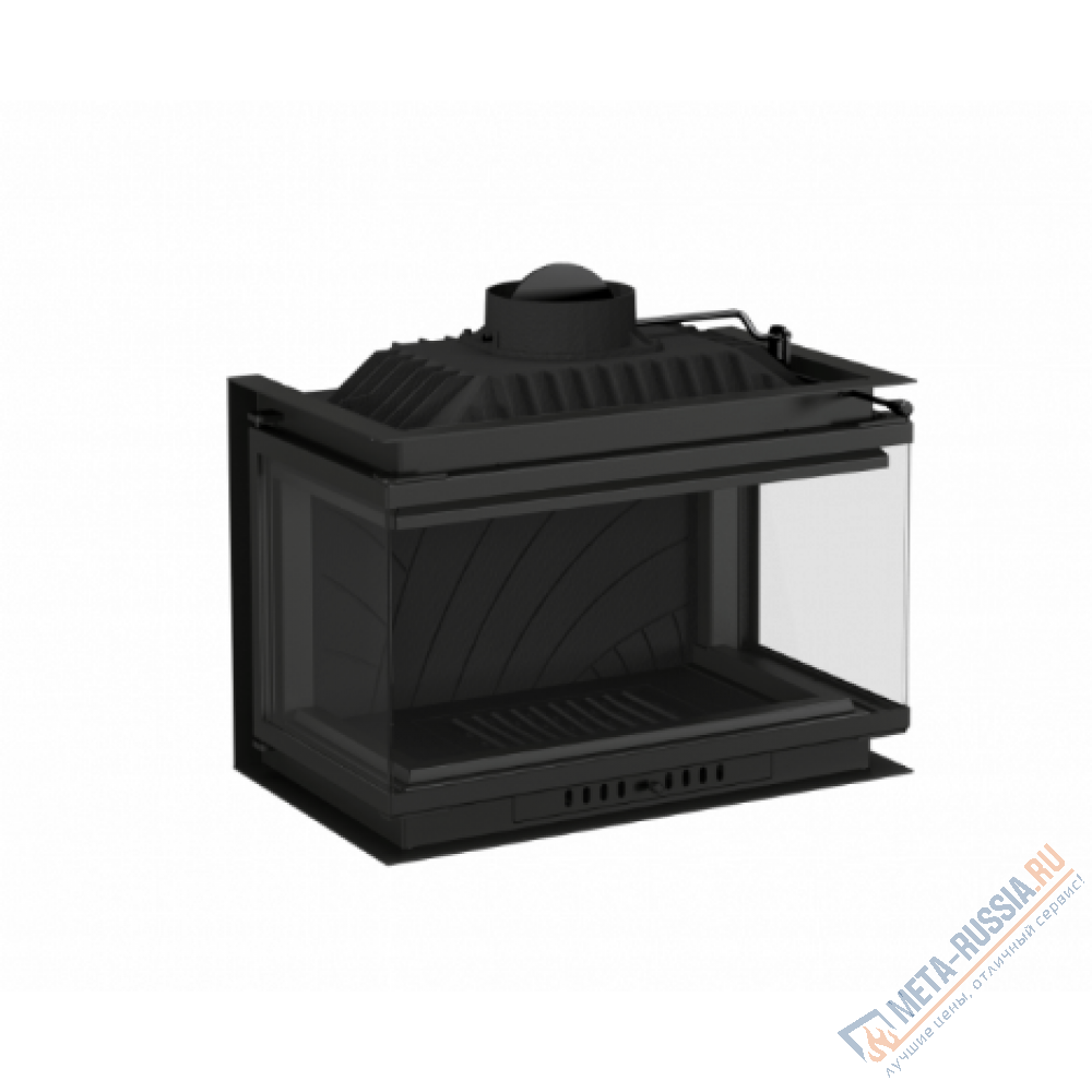 Составное стекло в П-образной стальной дверце, не имеет перемычек, обычно этот вариант используют в топках с гильотинным подъемом, а здесь только боковое открытие, что значительно снижает стоимость. Чтобы подложить дрова открывается Г-образная часть дверцы, с помощью скрытых защелок на правом углу сверху и снизу. Есть встроенный регулируемый шибер, двойная чугунная задняя стенка и система подачи воздуха вдоль стекла, чтобы при работе камина оно оставалось чистыми. Гарантия 5 лет.