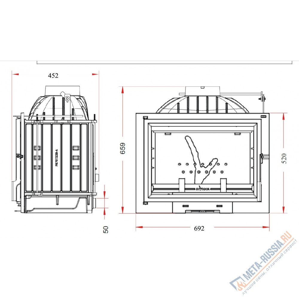 Топка INVICTA 700 Филос изготовлена методом вертикального литья и соединены между собой с помощью специальной системы жаропрочного герметика и подгонки. Крепления устроены так, что все болты и гайки находятся снаружи. Топка оснащена шиберной заслонкой. Шиберная задвижка регулирует тягу устройства, ею легко управлять рычагом, расположенным над стеклянной дверцей.
