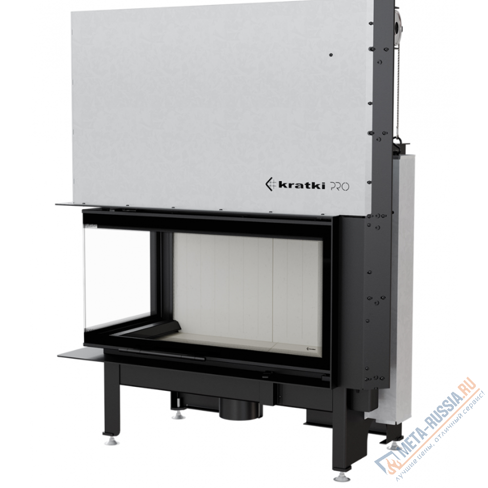 Угловая каминная топка NADIA/14/L/BS/G (левосторонняя с подъемным механизмом) от польского производителя Kratki с увеличенной площадью остекления декорирована шелкографией по периметру. Подъемный механизм скрыт под стальным кожухом. Стеклянная дверка может подниматься вверх, а также открываться в сторону для удобства очистки от налета сажи.