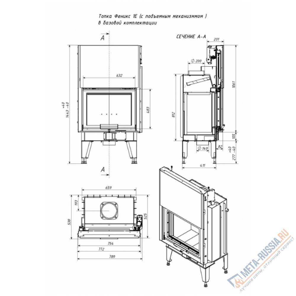 Каминная топка Мета FENIX 2E (ТКТ 10.0-04) с подъемным механизмом компактна и универсальна. Дно топки выложено шамотным кирпичом, а задняя и боковые стенки камеры сгорания футерованы 3D вермикулитом. Шамот и вермикулит – это природные, экологически чистые материалы, при их нагревании не выделяется запах и токсичные вещества. Вермикулит обладает высокой отражающей способностью, что существенно повышает полноту сгорания топлива.