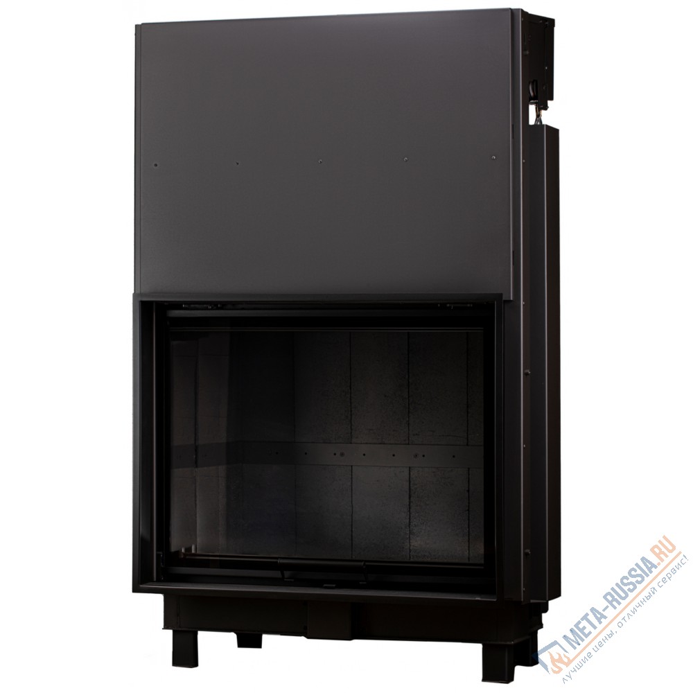 Каминная топка Мета FENIX 900 (ТКТ 11.0-01) с плавным и бесшумным подъёмным механизмом дверцы. Дно топки выложено шамотным кирпичом, а задняя и боковые стенки камеры сгорания футерованы 3D вермикулитом.