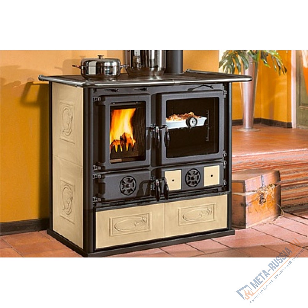 Печь-камин La Nordica (Ла Нордика) Rosa Liberty представляет собой удобную в эксплуатации и простую в монтаже дровяную печь. Вокруг плиты установлен хромированный поручень, который не только украшает печь, но и может служить опорой для подвешивания полотенец или каминных инструментов. Варочная плита, духовой шкаф и выгодная цена являются основными преимуществами этой печи. Конструкция топки чугунная, а духовка покрыта изнутри эмалью, что гарантирует длительный срок службы изделия и удобство в эксплуатации. Несколько уровней вставки дают возможность запекать еду на идеальной высоте или вставить сразу несколько противней. Пространство под духовкой можно использовать для обогрева, сушки посуды или просто в качестве места для хранения противней и решеток.