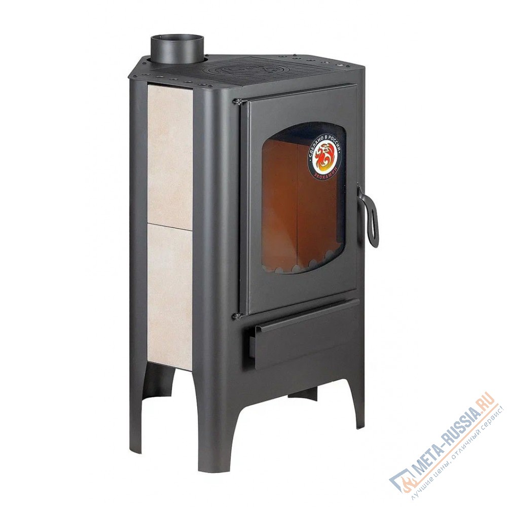 Печь-камин Экокамин Бавария Эко угловая с плитой мощностью 6 кВт легко справится с задачей обогрева небольшого загородного дома или дачи, а в качестве приятного дополнения сверху на крышке имеется варочная поверхность с одной конфоркой, на которой можно не только разогреть чайник, но и приготовить полноценные блюда для всей семьи. В качестве футеровки топки используется шамотный кирпич светлого цвета. Небольшое огнеупорное стекло имеет функцию самоочищения, благодаря чему любоваться игрой огня можно практически бесконечно.