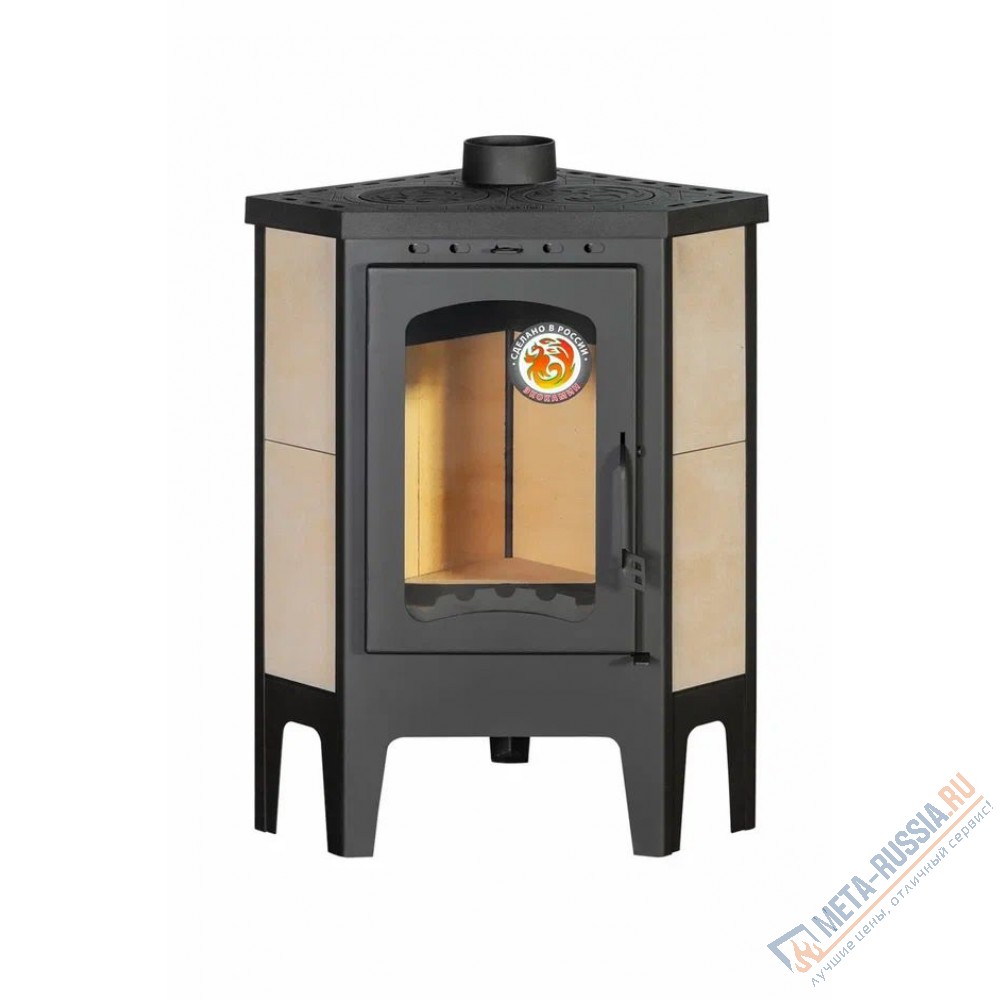 Печь-камин Экокамин Бавария угловая c плитой мощностью 9 кВт с эффективностью 80% легко справляется с задачей обогрева небольшого загородного дома или дачи, а в качестве приятного дополнения сверху на крышке имеется варочная поверхность с двумя съемными конфорками, на которой можно не только разогреть чайник, но и приготовить полноценные вкусные блюда для всей семьи. В качестве футеровки топки используется шамотный кирпич. Небольшое огнеупорное стекло имеет функцию самоочищения, благодаря чему любоваться игрой огня можно практически бесконечно.