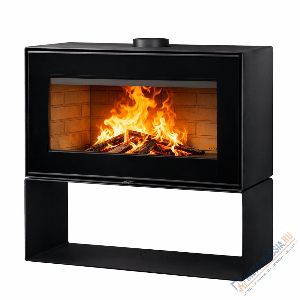 Печь-камин Мета Монблан оснащена масштабным панорамным стеклом размером 1000*520 мм., которое оформлено черным принтом по периметру. Топка легко вмещает дрова длиной до 800 мм.