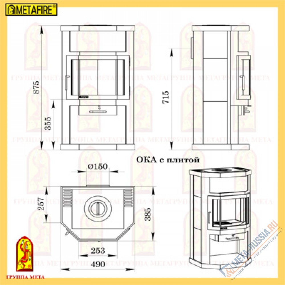 Корпус печи-камина Мета Ока с плитой изготовлен их жаропрочного металла и покрыт жаростойкой краской черного цвета. По бокам декорирована керамикой. Плита из стали толщиной 8 мм. Имеет одну конфорку с кольцами.