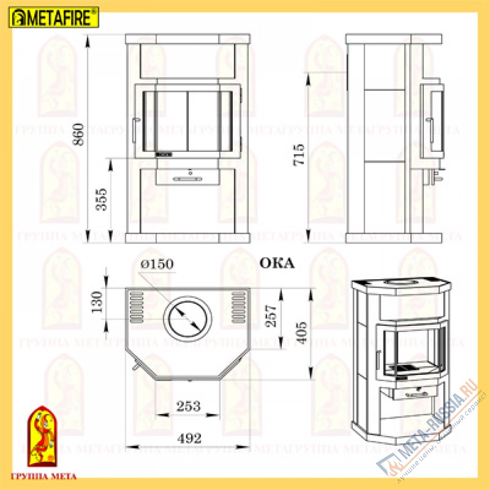 Корпус печи-камина Мета Ока изготовлен из жаропрочного металла и покрыт жаростойкой краской черного цвета. По бокам декорирована керамикой.