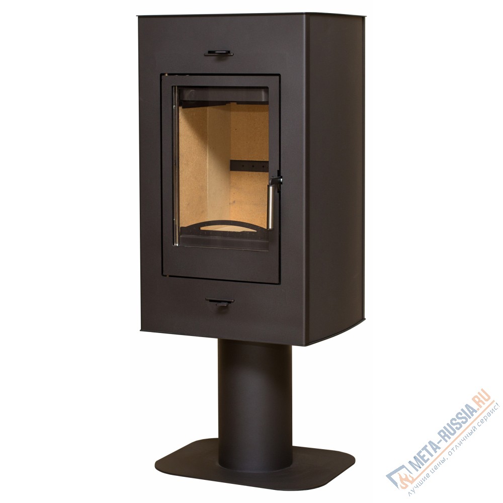 Корпус печи-камина Мета Рона расположенный на элегантной ножке, и вращающийся механизм на 360 градусов добавляют легкости интерьеру и дают возможность ощутить лучистое тепло во всех углах помещения. Она изготовлена из жаростойкой стали, а в качестве облицовки используется высококачественная листовая сталь, окрашенная термостойкой эмалью черного цвета, отличающаяся хорошей теплопроводностью и минималистической простотой.