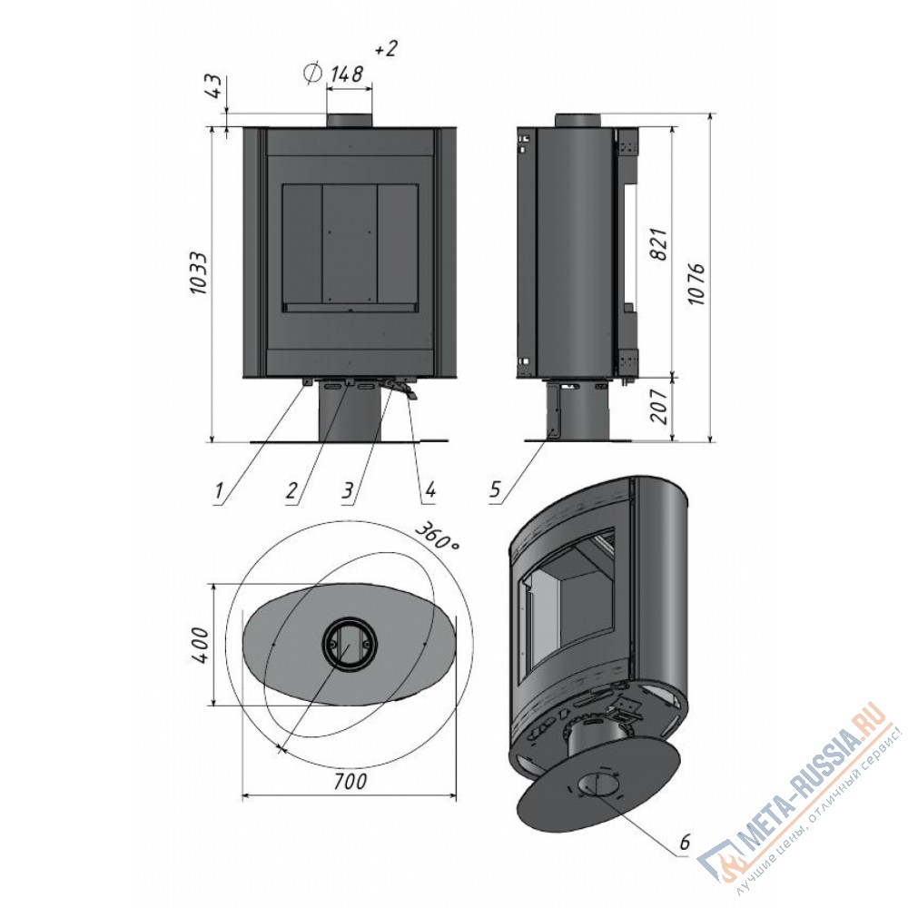 Корпус печи-камина Мета Свитязь расположенный на элегантной ножке, и вращающийся механизм на 360 градусов добавляют легкости интерьеру и дают возможность ощутить лучистое тепло во всех углах помещения. Она изготовлена из жаростойкой стали, а в качестве облицовки используется высококачественная листовая сталь, окрашенная термостойкой эмалью черного цвета, отличающаяся хорошей теплопроводностью и минималистической простотой.
