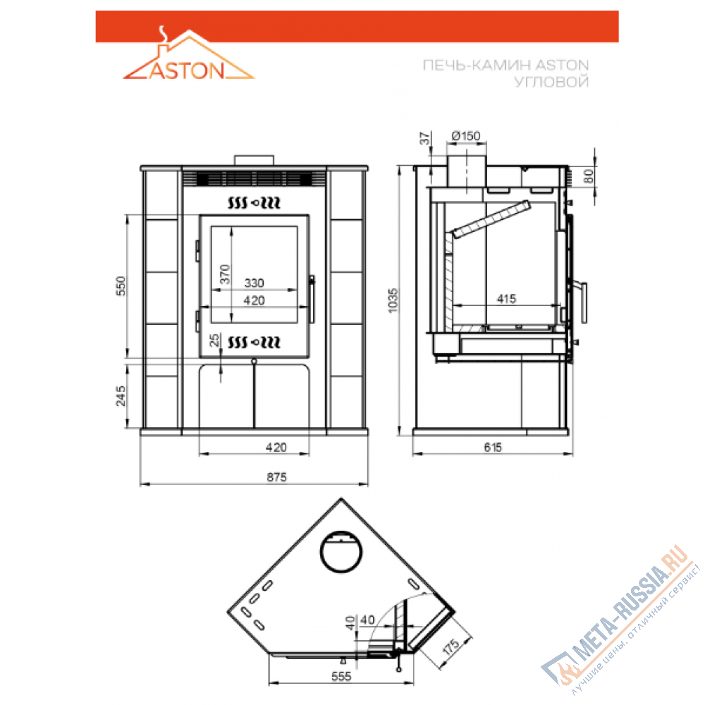 Технические характеристики Печь-камин ASTON 11кВт (180 м3) угловой d=150мм Амфиболит: