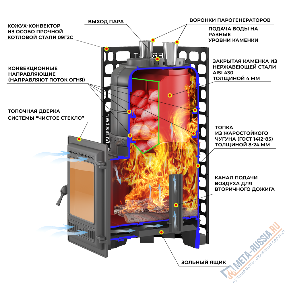 Закрытая каменка печи изготовлена из нержавеющей стали марки AISI 430 толщиной 4 мм. Каменка размещается прямо на пути пламени и горящих газов, что позволяет нагревать камни со всех сторон и быстро достигать температуры 450-500 градусов по Цельсию.