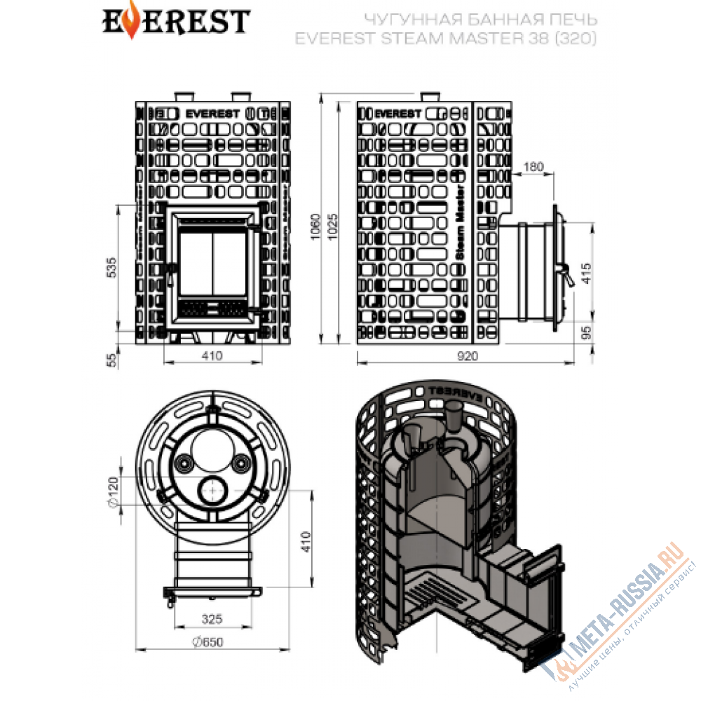 Банная печь Эверест "Steam Master" 38 (320) ЧУГУН предназначена для нагрева помещений и получения пара в парных объёмом до 38 кубических метров.