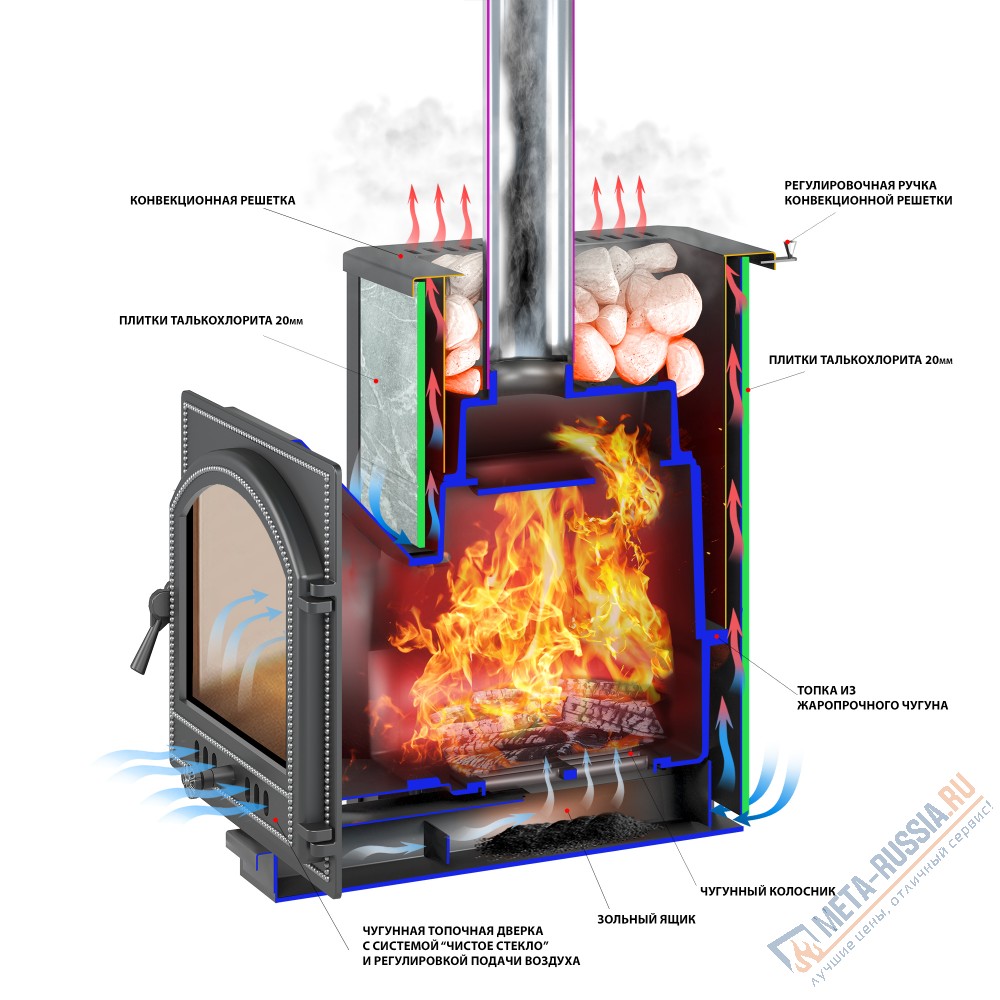 Преимущество печи в том, что топка печи состоит из 3-х ЧУГУННЫХ элементов. На стыке между ними используется керамический шнур с рабочей температурой 1200 градусов. То есть топка печи абсолютно герметична! Для фиксации деталей между собой применяется болтовое соединение, что даёт 100% гарантию безопасности при эксплуатации.
