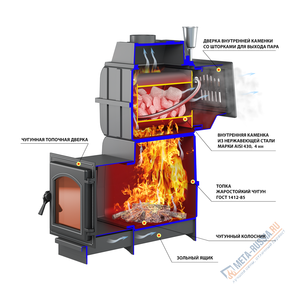 Чугунная печь для бани ВЕЗУВИЙ Легенда Русский Пар Ковка 18 (Дверь: 270)? — это дровяная печь для бани с закрытой каменкой, мощностью 18 кВт.