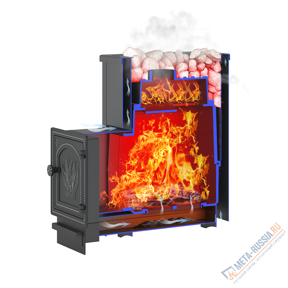 ВЕЗУВИЙ Сенсация 22 (ДТ-4) Б/В укомплектована чугунной герметичной дверцей Везувий ДТ-4. Объемная, вентилируемая каменка позволяющая максимально быстро нагреть камни с четырёх сторон в кратчайшие сроки. что значительно ускоряет нагревание воздуха в парилке за счёт образуемого им мощного конвекционного потока.