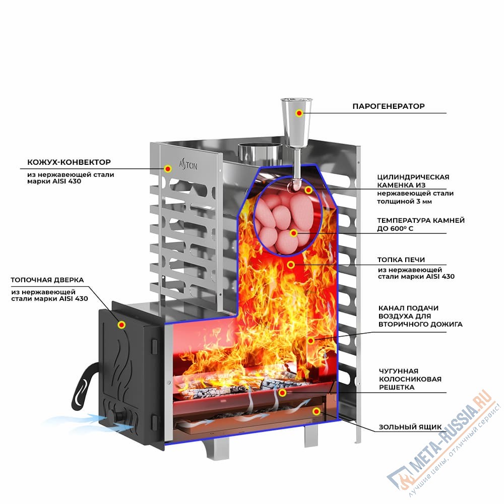 - Печь ASTON из нержавеющий стали марки AISI 430 устойчива к окислению и прогару.